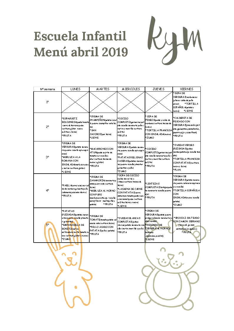 Menú de abril por Escuelas Kym | Abr 27, 2019 | Alcalá de Henares, Kym, Los Hueros | 0 Comentarios Hola Familias! Aquí podéis consultar, o descargaros, nuestro menú para abril: Menú de abril en Escuelas Kym Un abrazo!
